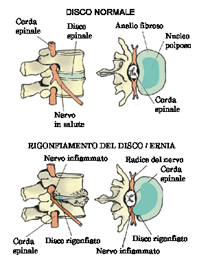 parte gelatinosa interna sporge in fuori formando l'ernia, irritando i nervi